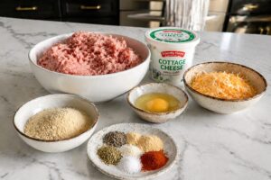 In a large bowl, combine the ground turkey, cottage cheese, shredded cheddar, breadcrumbs, and egg.