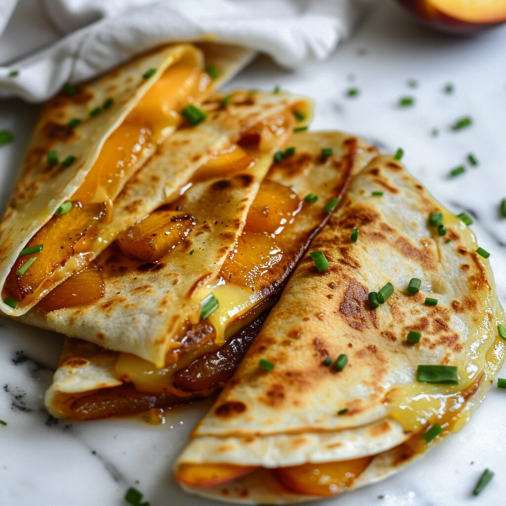 Enjoy these freshly cooked quesadillas with perfectly browned, crisp tortillas enveloping a gooey interior. These are filled with juicy, caramelized peach slices and melted Brie cheese. They offer a delicious sweet and savory combination. Garnished with fresh green chives, each bite provides a delightful contrast of textures and flavors.