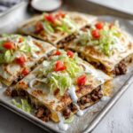 - Lay three tortillas on the prepared sheet pan, slightly overlapping to create a base. Evenly spread the seasoned ground beef over the tortillas. Sprinkle the shredded cheese evenly over the beef. Place the remaining tortillas on top, lining them up as best you can to cover the filling. Lightly spray the tops of the tortillas with olive oil spray.