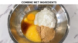 - Mix wet ingredients into a separate bowl: Egg, Greek yogurt, Melted light butter, Brown sugar substitute, Vanilla extract