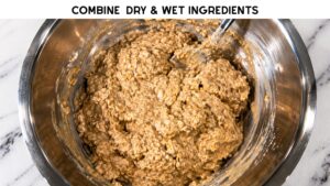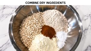 - Mix dry ingredients into a large bowl: Oats, Oat flour, Protein powder, Baking soda, Cinnamon Salt